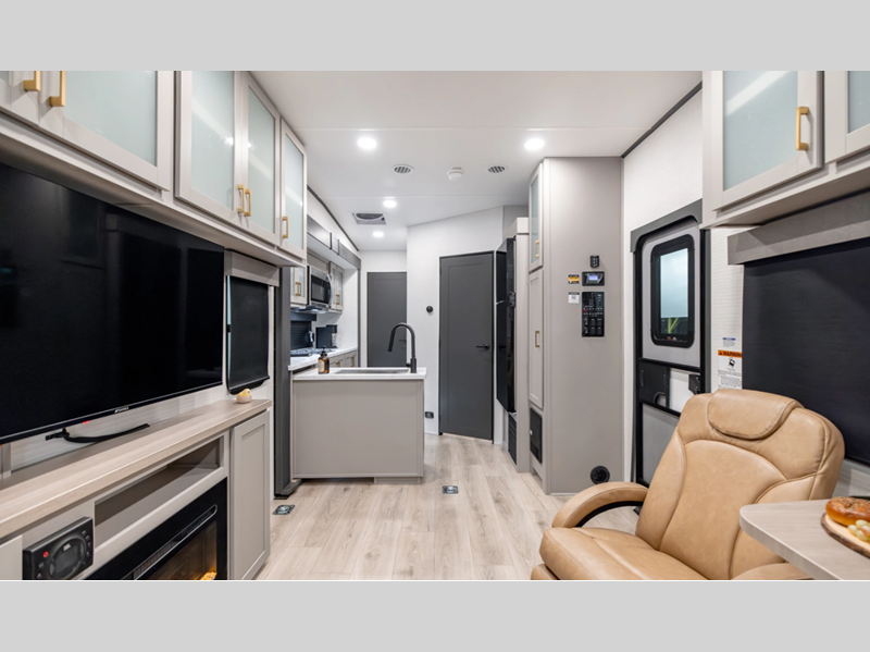 Sleeps 6 Length 34 ft 1 in Ext Width 8 ft 6 in Ext Height 12 ft 9 in Hitch Weight 1470 lbs GVWR 13470 lbs Dry Weight 8429 lbs Cargo Capacity 5041 lbs Fresh Water Capacity 102 gals Grey Water Capacity 82 gals Black Water Capacity 42 gals Tire Size 16" Furnace BTU 35000 btu Fuel Capacity 40 gals Number Of Bunks 1 Available Beds King Refrigerator Type 12V Refrigerator Size 10.7 cu ft Convection Cooking Yes Cooktop Burners 3 Number of Awnings 1 Axle Weight 6000 lbs Garage Size 16 ft 1 in LP Tank Capacity 30 lbs Water Heater Type Tankless AC BTU 15000 btu Awning Info With LED Lights Axle Count 2 Number of LP Tanks 2 Shower Type Radius Solar Wattage 200 watts Similar Floorplans