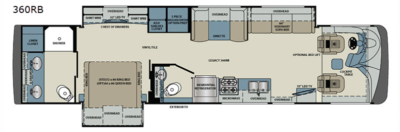 A bath an a half, two slide outs, and plenty of space, are just some of the features that will draw you to this Legacy SR 340 360RB class A diesel motor home by Forest River! This unit is even prepped so that you can add the optional washer/dryer and stay clean throughout your entire trip. There is plenty of seating options between the cockpit, visionary sofa bed, and the booth dinette. If you've exhausted yourself with outdoor activities then you can re-coop by watching your favorite movies on one of the three TV's, one of which is located outside!